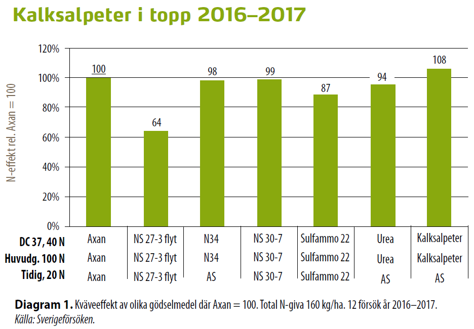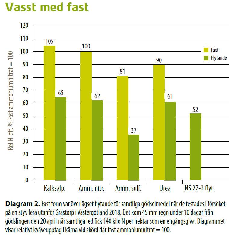 Som tidigare rapporterats i Växtpressen nr 1/18 hade flytande kvävegödselmedel som testades i Sverigeförsökens försöksserie L3-2300 mycket låg kväveeffektivitet i jämförelse med fasta gödselmedel som Axan® eller Kalksalpeter™. I medeltal gav flytande NS 27-3 bara ca 64 procent effekt jämfört med Axan (diagram 1).