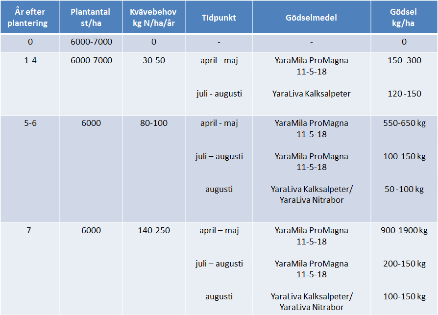 Kommentar till gödslingsprogram: Gödslingsprogrammet är anpassat för kungsgran, Abies nordmanniana, på siltjordar och lerjordar. På lättare jordar som sandjord rekommenderas det att öka givan med 40-50%. Den större gödselgivan är tänkt till slutet av respektive tidsperiod.