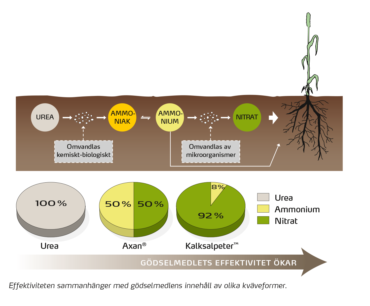- Urea används mycket i övriga delar av världen. Omvandlingen av urea till för växterna lättupptagbart nitratkväve sker i två steg. Först bildas ammonium genom hydrolys (kemisk process). Sedan sker nitrifikationen med hjälp av mikroorganismer. Hydrolysen är en relativt snabb process, medan omvandlingen till nitratkväve kan ta lång tid beroende på markfukt och temperatur. Eftersom det inte finns något nitratkväve tillgängligt direkt, är urea ett mer långsamverkande gödselmedel än andra kväveprodukter. Bredspridd urea har på grund av förluster och långsam verkan ofta 10-25 % sämre effektivitet än övriga gödselmedel. Generellt är N-effekten av urea mycket varierande och osäker. Det är också förbjudet att sprida gödselmedel som innehåller ureakväve på obevuxen mark utan att mylla eller bruka ner den inom 4 timmar (SVJFS 2009:82 23§)