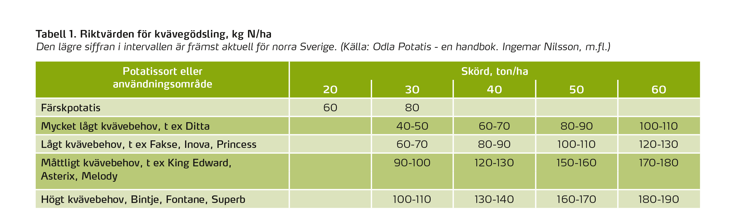 Kväve är starkt skördepåverkande men har också kraftig inverkan på knölens kvalitet. För lite kväve ger, förutom en låg skörd, ökad risk för sönderkokning. För mycket kväve ökar risken för blötkokning och mörkfärgning. Ju längre norrut odlingen ligger, desto lägre är ofta behovet av kväve. Kvävebehovet påverkas även av beståndstäthet med mera. Vid högre beståndstäthet bör kvävegivan ökas.