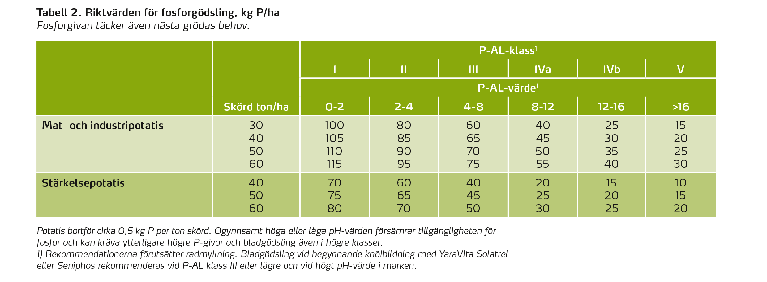 Potatis bortför cirka 0,5 kg P per ton skörd. Ogynnsamt höga eller låga pH-värden försämrar tillgängligheten för fosfor och kan kräva ytterligare högre P-givor och bladgödsling även i högre klasser. 1) Rekommendationerna förutsätter radmyllning. Bladgödsling vid begynnande knölbildning med YaraVita Solatrel eller Seniphos rekommenderas vid P-AL klass III eller lägre och vid högt pH-värde i marken.