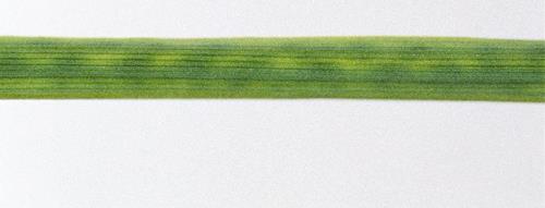 Med början från bladspetsen blir äldre blad ljusgröna med mörka prickar av klorofyll (lätt att se om man håller bladet i solljus). Tvärrandigt utseende pga kloroser mellan bladnerverna. Små ljusa fläckar spridda över bladet. Nekroser uppkommer på bladspetsarna.