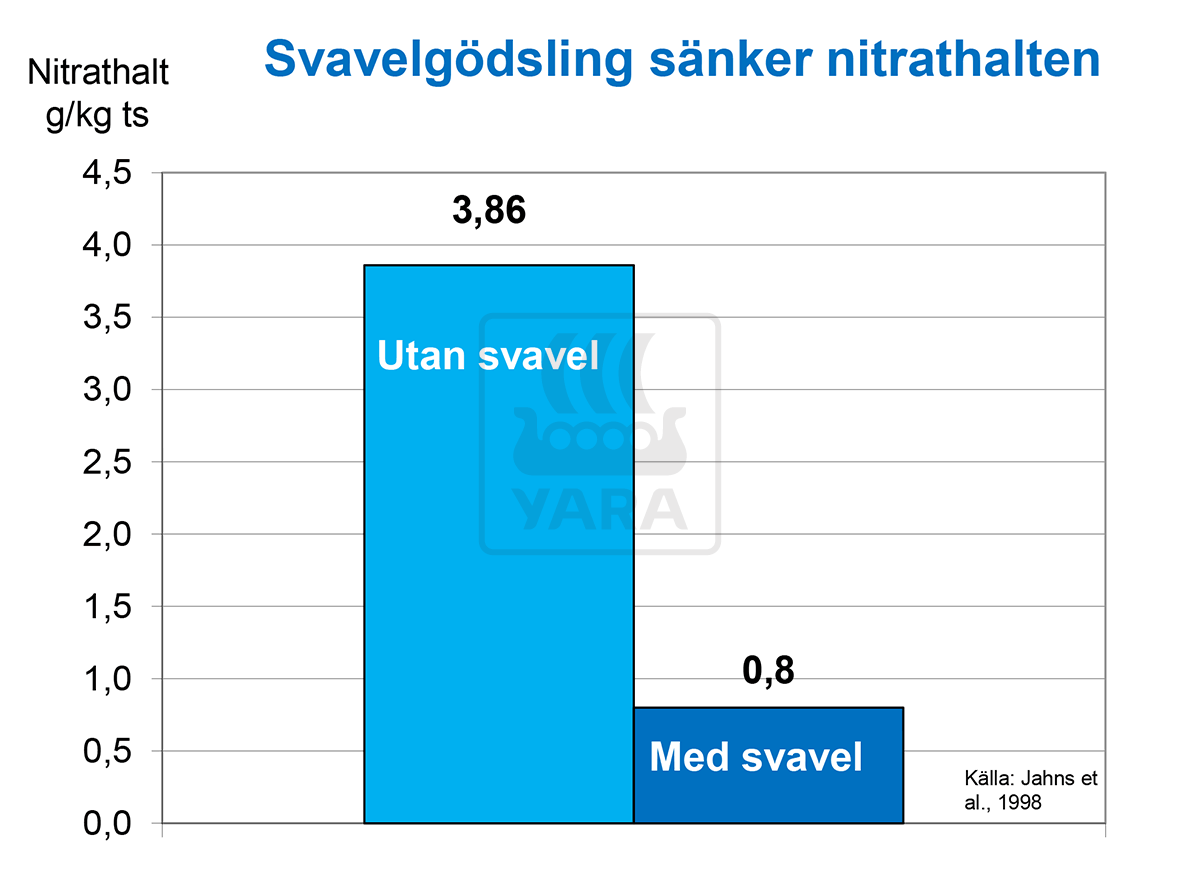 Om grödan lider brist på svavel kan nitrathalten i vallfodret öka. Vallen tar upp kväve från marken i form av nitrat. I växten omvandlas därefter nitrat till aminosyror som i sin tur bildar proteiner. Om grödan inte har tillgång till svavel i tillräcklig mängd, kan inte de två svavelhaltiga aminosyrorna metionin och cystein bildas i tillräcklig mängd. Dessa aminosyror är mycket viktiga för en fullständig proteinsyntes. När inte proteinbildningen fungerar kan nitrathalten i växten bli hög. Detta kan vara en viktig orsak till de höga nitrathalterna 2013.