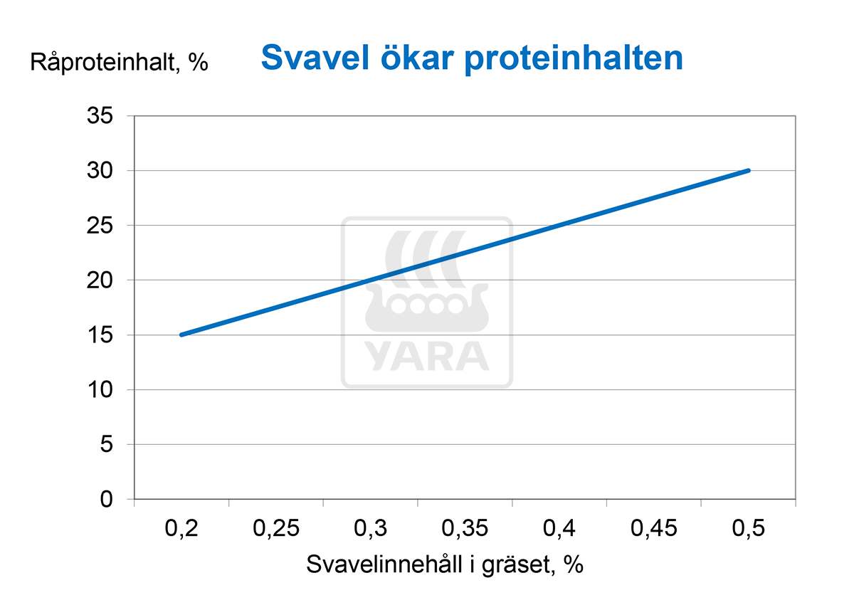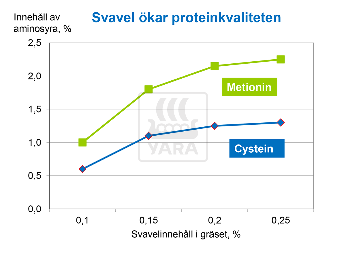 Diagrammet visar att ju högre svavelhalt gräset har, desto lättare kan gräset bilda aminosyrorna metionin och cystein. Dessa aminosyror innehåller svavel och är mycket viktiga för proteinbildning och proteinkvalitet.